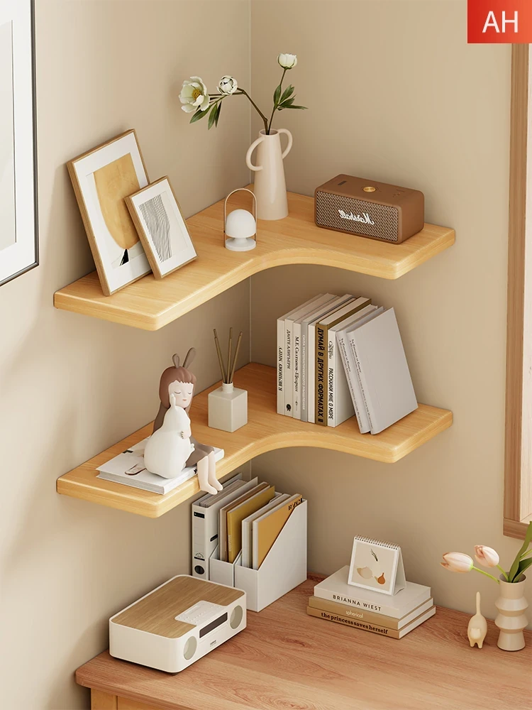 Solid Wood Wall-Mounted Bookshelf - L-Shaped Corner Storage Rack for Living Room and Kitchen - Stylish Spice Organizer and Decorative Shelf for Home Décor