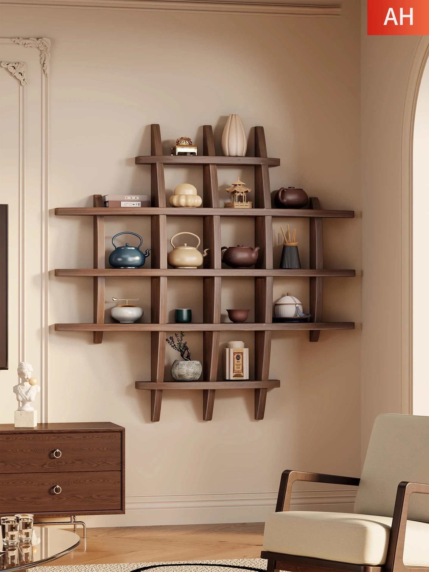 Wall-Mounted Antique Display Shelf with Cubes - Solid Wood Chinese Tea Set & Yixing Teapot Storage Rack for Tea Leaves and Accessories